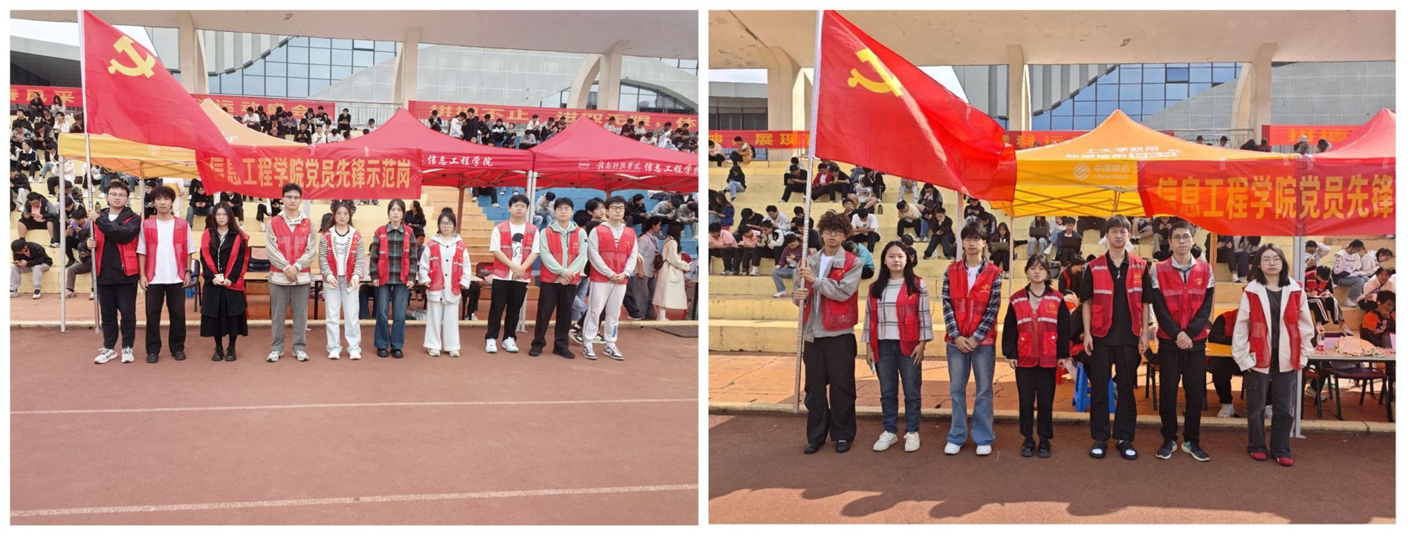本网讯:10月31日至11月1日,学校第二十三届运动会盛大启幕,赛道上的冲刺点燃全场欢呼,领奖台的荣光闪耀晴空。而在这些热血瞬间之外,信息学院学生支部党员先锋示范岗的志愿者们,以一抹“志愿红”生动诠释了“团结友爱、追求卓越、忠诚担当”的“三信精神”。他们身穿红马甲、手持垃圾袋,穿梭在看台缝隙与跑道边缘,将散落的纸屑、空瓶一一拾起,用指尖的细致守护赛场的洁净,让“红色力量”成为盛会中最温暖的底色。