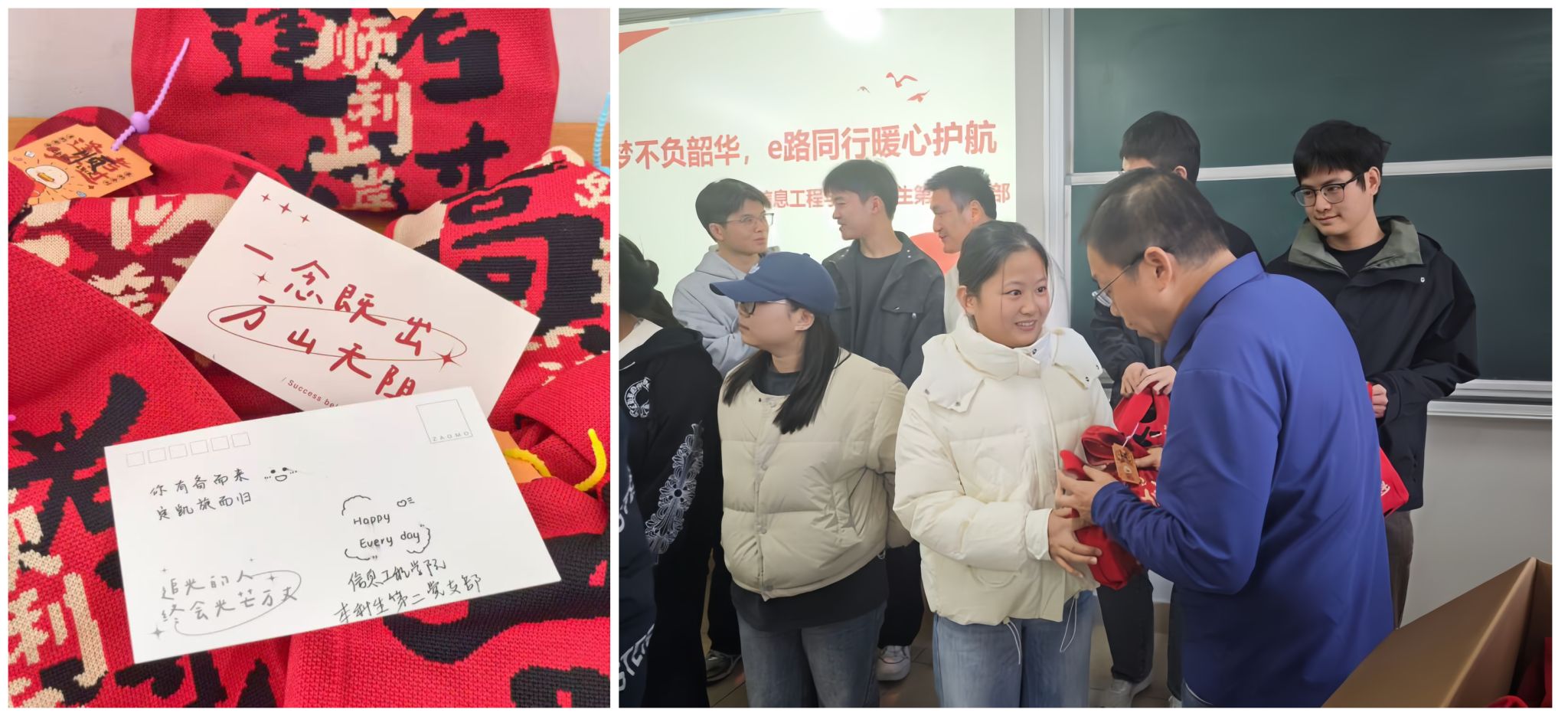 为帮助同学们解决备考中的实际需求,党支部提前调研,精心准备了包含实用文具、暖心物资等在内的“备考加油包”。在发放环节,学院党委副书记邓小鸿同志、党支部书记、支部委员及教师党员代表亲手将“加油包”递到同学们手中,每一份“加油包”都承载着党组织的牵挂与祝福。同学们接过礼包时脸上洋溢着感动的笑容,纷纷表示感受到了集体的温暖,备考的信心更足了。