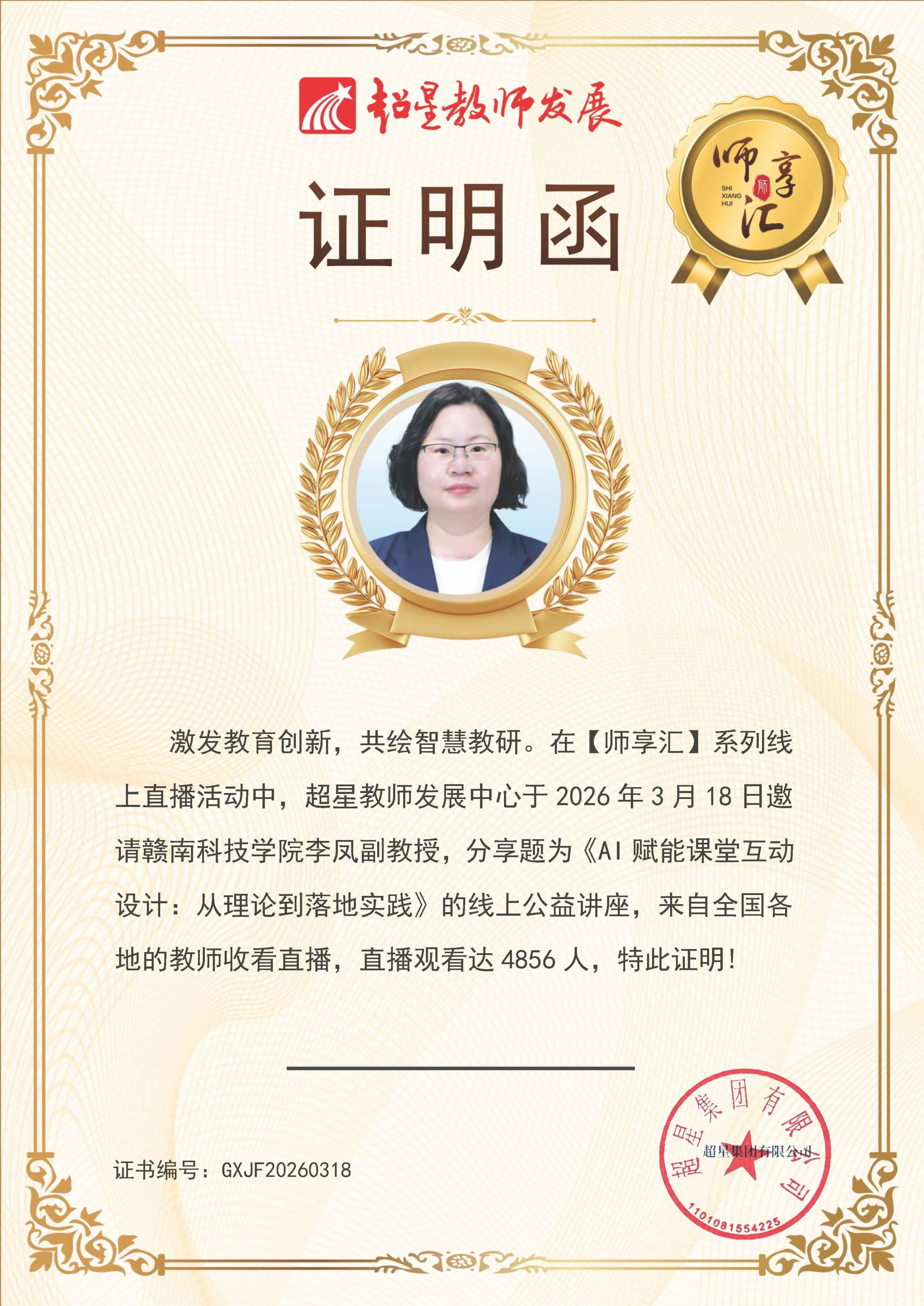 此次专题分享,不仅是对李凤副教授个人教学创新能力与学术视野的高度认可,更是我校近年来持续推进教育数字化转型、深化课堂教学改革成果的一次精彩亮相。通过此次云端交流,显著扩大了WilliamHill威廉希尔的社会影响力和美誉度,为全国同行应对AI时代的教学挑战贡献了“赣科院智慧”与参考范式。