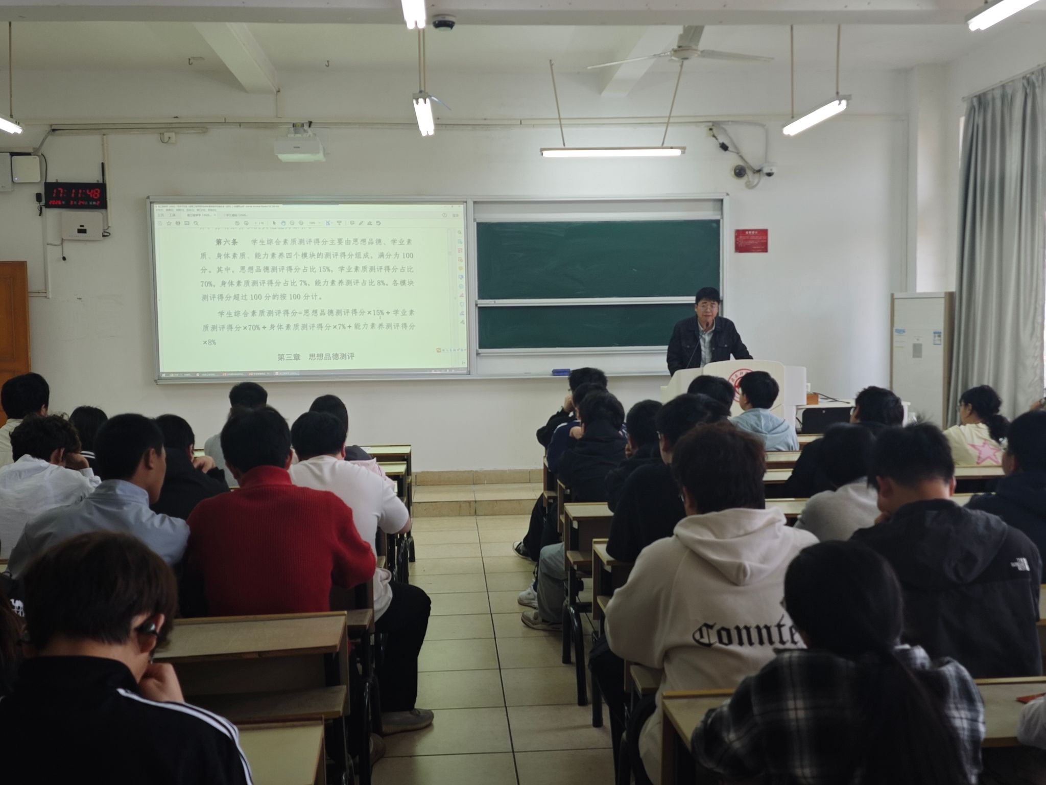 此外,魏炳辉重点解读《williamhill英国学生晚归及夜不归宿处理办法(试行)》,对晚归认定情形、分级处罚措施、请假报备流程等进行逐条细化说明,要求班长配合辅导员和班主任切实履行班级管理责任,常态化开展宿舍作息督查,筑牢校园安全防线,保障学生身心健康与校园秩序稳定。钟辉老师聚焦学生综合素质提升,对《WilliamHill威廉希尔学生综合素质测评实施办法》及《williamhill英国学生综合素质测评实施办法(试行)》进行全面解读。他从测评指标体系、评分细则、申报流程、结果应用等方面展开说明,重点讲解思想品德、学业素质、身体素质、文体竞赛、志愿服务能力素养等四个核心测评维度的计分规则,引导班长精准把握测评标准,协助同学规范申报材料,助力学生全面发展。