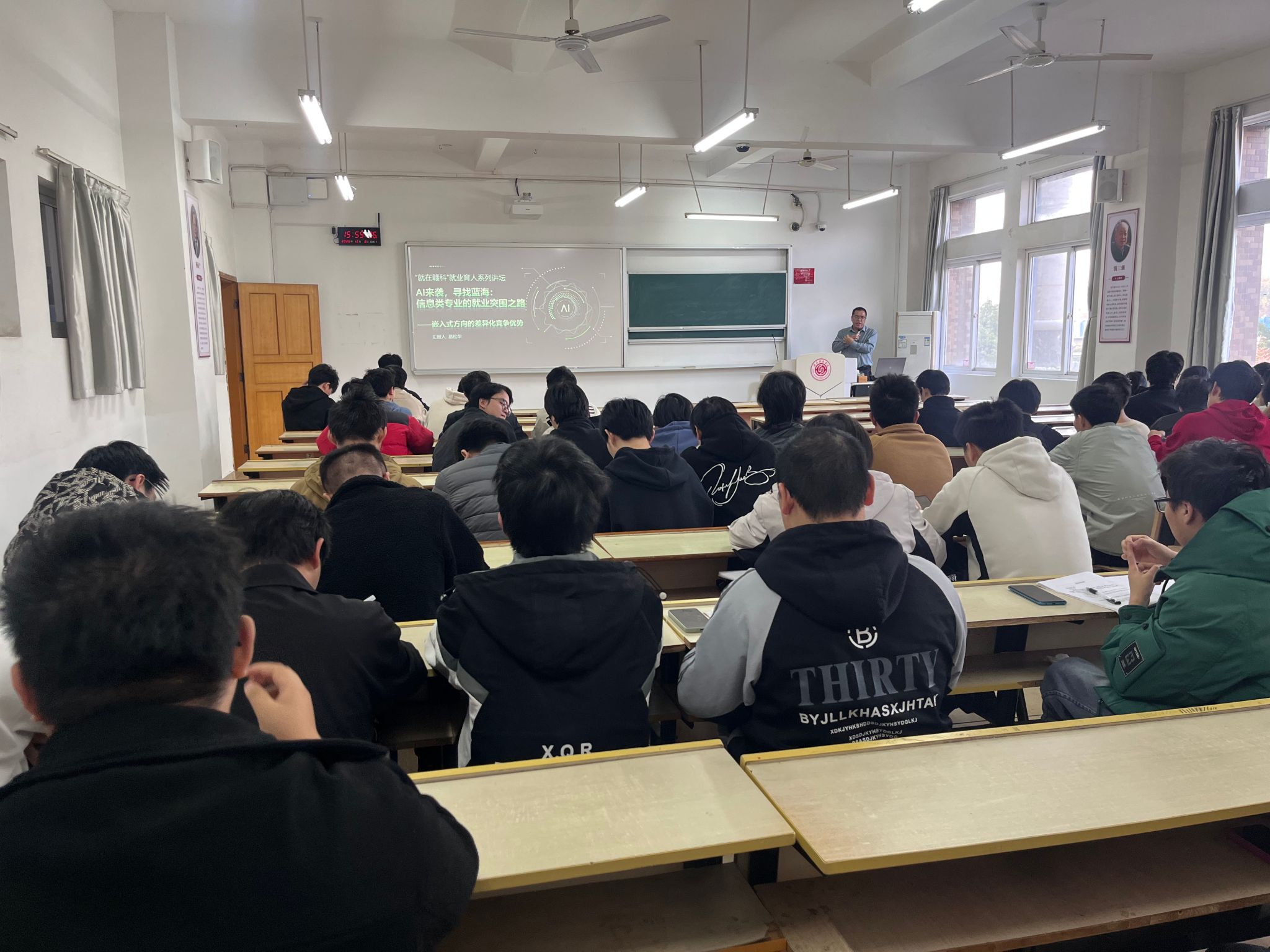 讲座紧密围绕当前信息类专业学生面临的就业现实展开深入剖析。易松华指出,随着人工智能技术迅猛发展,传统岗位结构正经历深刻变革,技术迭代加速,同质化竞争日益凸显,就业市场对人才的复合能力与实践经验提出了更高要求。在此背景下,尽早明确职业方向、聚焦具有长期成长性的技术领域,成为破解就业压力的关键。